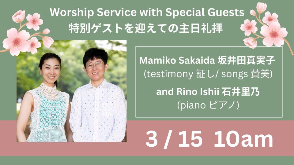On Sunday, March 15th from 10:00am, Mamiko and the pianist Rino Ishii will be joining our worship service. Mamiko will be sharing her testimony and some musical pieces. Rino Ishii will be playing the piano.